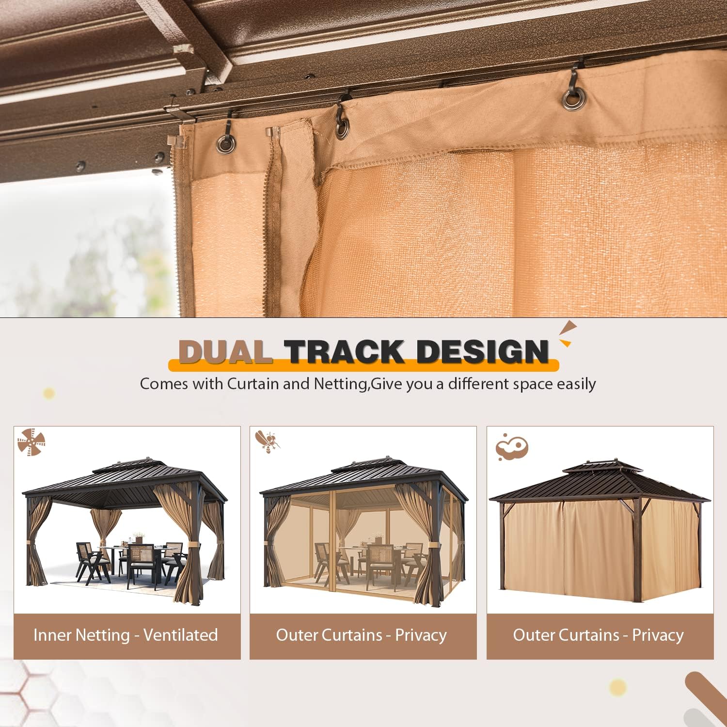 - [ NETTING & CURTAINS ] The gazebo curtains are made of 180G M2 polyester fabric and PU, which is CPAI-84 certified, flame resistant.Detachable curtains and netting can be adjusted through dual-track seperatly, offer a fully sheltered privacy space, while having sufficient airflow and visibility.Fully enclosed zippered double layer sidewall protect you from UV rays while adding more privacy.