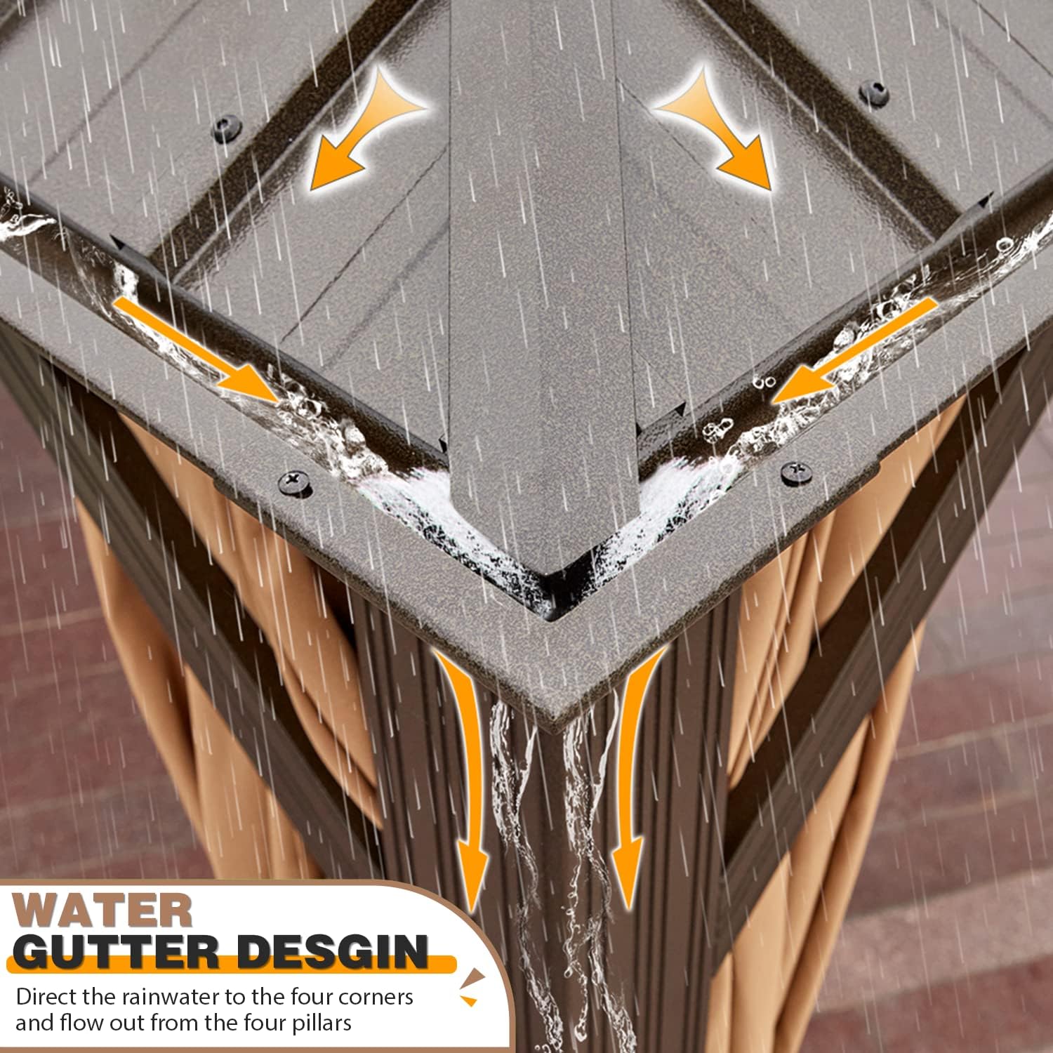 - [ WATER GUTTER DESIGN ] Unique design allows rainwater to flow from the edge of the aluminum Gazebo top frame into the pole and then to the ground.Reduce troubles and worries during the rainy season.Targeted design to keep the gazebo always in excellent condition and extend the service life.
