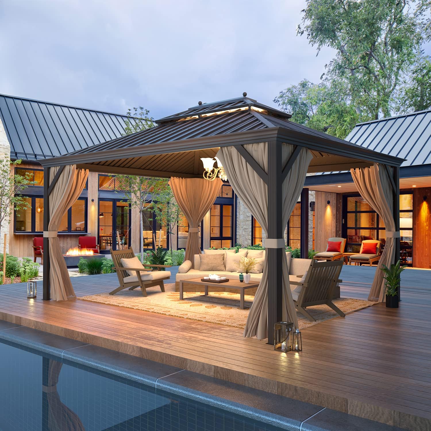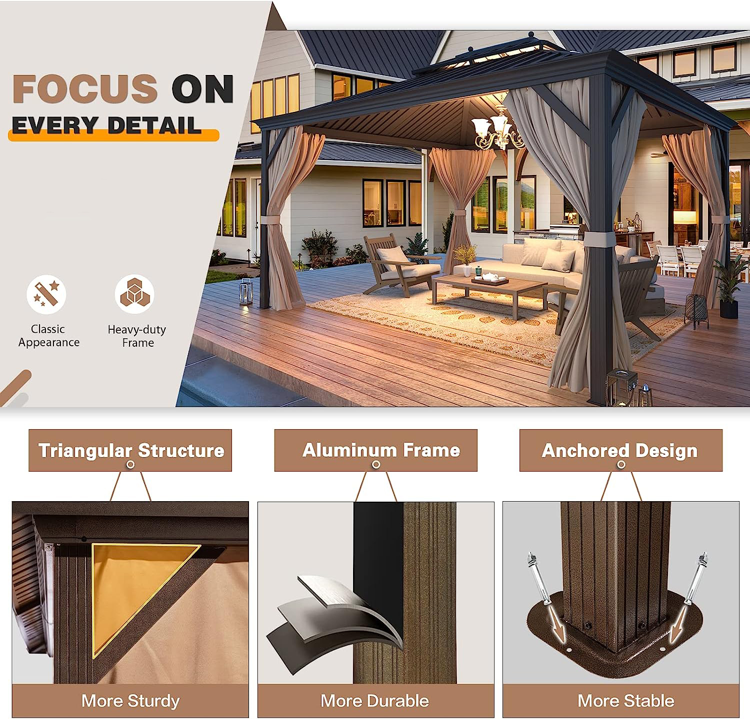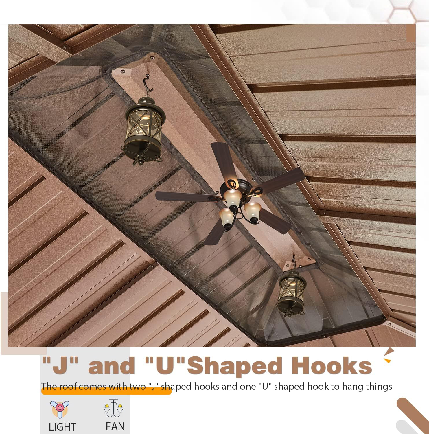 - [ VENTED DOUBLE HARDTOP ] Compared with one layer design, this double gazebo canopy allows sunlight to filter though and provides excellent airflow and the sloped roof allows rainwater to slide right off. Hardtop gazebos for patios can tolerate high summer temperatures and withstand UV rays,provides you plenty of cool shade to enjoyment.Finally, the interior hooks on the ceiling can be used for hanging the lamp or heater.