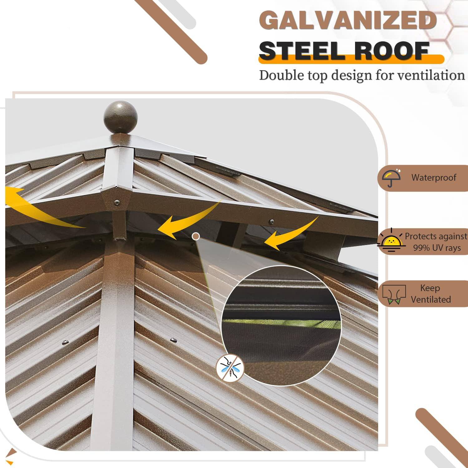 - [ GALVANIZED STEEL ROOF ] Size: 10'X 12' Permanent Gazebo. Beautiful hard metal top instead of normal fabric or polycarbonate material.Compare to a traditional soft top,Galvanized steel metal top can withstand heavy snow, which provide you a privacy, safe and cool room.
