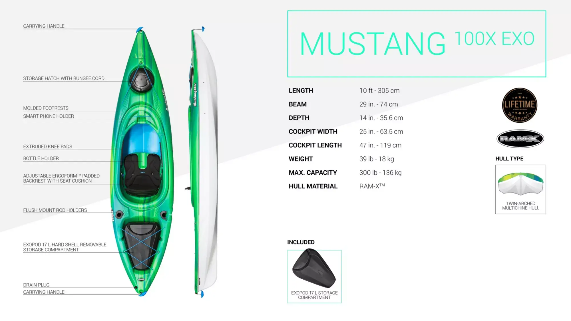 Made for fishing and easy to paddle, the Pelicani Mustang 100X Kayak offers comfort, stability and awesome performance all in one boat. The Mustang includes fishing rod holders, plenty of storage, and also a removable storage container. This kayak boasts a rigid construction that’s built tough.