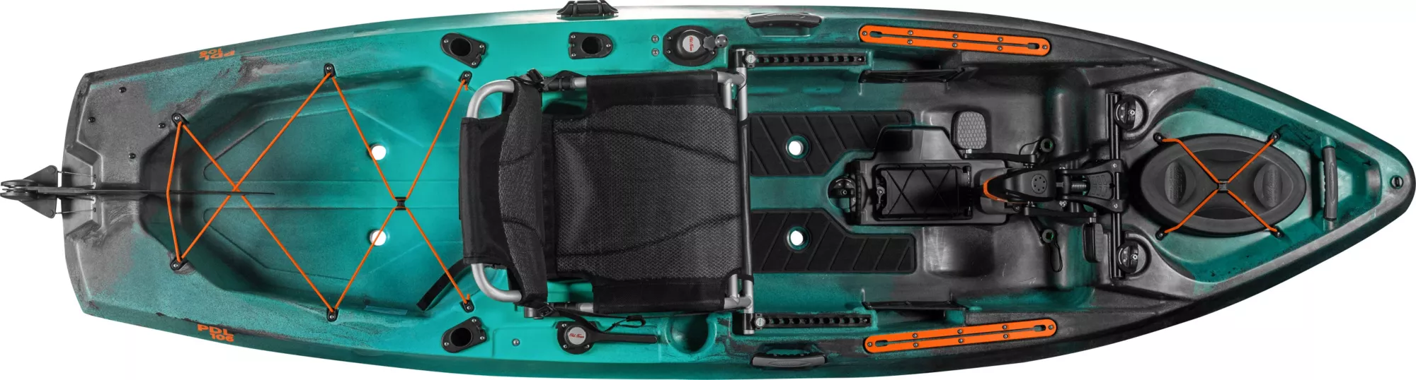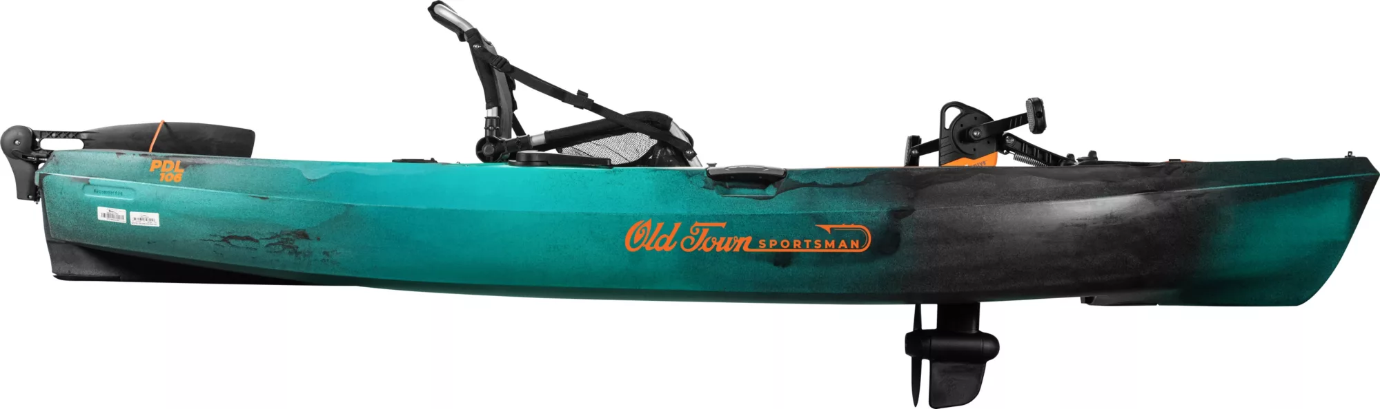 The Old Town Sportsman PDL 106 pedal kayak provides hands free fishing in a performance kayak that's easy to maneuver and light enough to car top. With instant forward and reverse, the award-winning PDL Drive is the most reliable and easy-to-use pedal drive on the market.Ultra-stable DoubleU Hull glides quietly through water while providing a stable and comfortable stand-up fishing platformLow maintenance PDL Drive with patented easy-docking system for pain-free launch and landing. Covered by industry's first-in-class 5 year warrantySuperior seat design has great lumbar support and is adjusted to accommodate leg length on a shuttle track. The mesh cover provides ventilation and drainage to keep you dry.Two 18" tracks on the forward hull provide easy on/off accessory mountingOne forward-facing and two rear-facing flush mounted rod holders are there when you want them, and out-of-the-way when you don'tNon-slip EVA foam deck pads provide traction and stand-up comfortRod and tackle management is made easier by the oversized tank well in the stern, storage under the seat and side pockets just below the accessory tracks. Dedicated horizontal rod storage for quick access.Dry storage for additional gear in the sealed bow hatchCup holder for your favorite beverageUniversal transducer mounting system allows for quicker installation of your fish finderA clip on the side of the hull secures your backup paddle, out of the way unless you need itPDL Drive and Seat are removable for easy transport and storageCustom tackle box included.Total Boat Capacity: 450 poundsAssembled Hull: 76 poundsPedal Console: 18 poundsUsable capacity for people and gear: 356 pounds