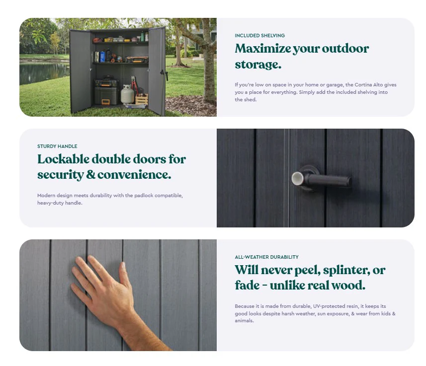 Need a shed, but maybe a shed on the smaller side? The Cortina Alto Storage Shed is the perfect solution! This space-saving shed is a great spot to store things like gardening supplies and long-handled yard tools like rakes. The shed is great for taller items that would be challenging to store in a horizontally shaped shed.