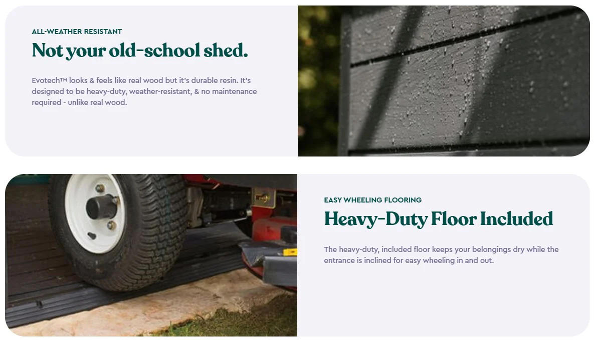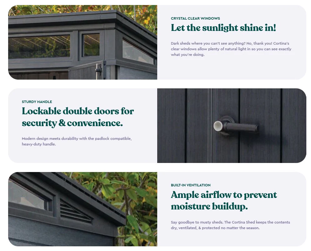 With its ample dimensions, this sturdy and large shed accommodates your storage needs while maintaining an attractive aesthetic. Experience convenience and resilience harmoniously united in the Cortina shed—your ultimate storage solution. Cortina sheds feature panels made from Evotech+.