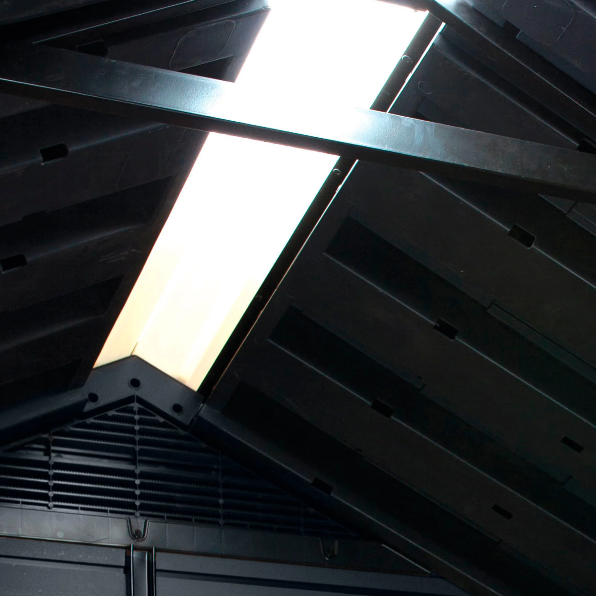 The spacious interior easily accommodates larger items, while the sturdy built-in floor keeps everything elevated and protected. Crafted with innovative Evotech+ panels, this shed combines the timeless look of natural wood with the superior durability of resin. It resists rust, rot, and peeling, ensuring a maintenance-free experience.