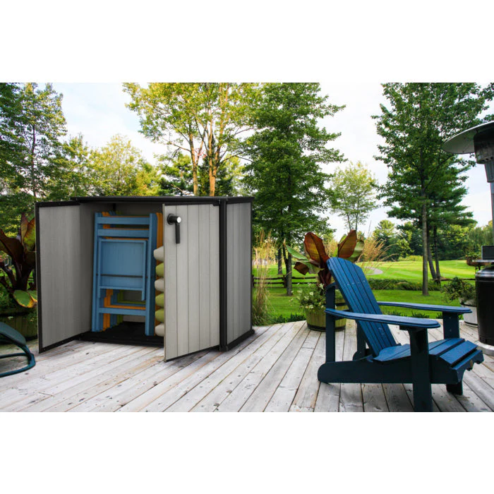 The Patio Store is extremely versatile and durable. Elegant and practical, this storage unit will look fantastic in any garden, patio or balcony, as it brings a chic rustic accent to your outdoor space with its highly realistic wood effect texture. The 1000L capacity provides plenty of storage space for furniture and pillows, pool equipment, or a lawnmower, while the strong roof is perfect for placing planters or gardening tools. Heavier items can be easily rolled in and out of the unit thanks to the sloped threshold. The Patio Store also comes with lockable doors, heavy-duty 105° nickel hinges, and adjustable brackets that let you quickly install an extra shelf, if needed.