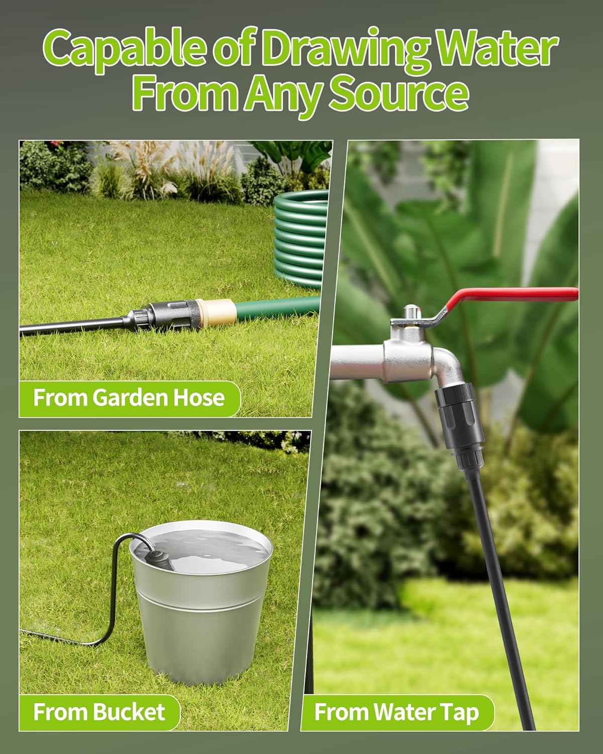 - [Draw Water Anywhere with 23ft Extra-Long Hose] Our car washer features a 23ft extra-long hose, ensuring a greater working distance than other models. The weighted filter basket makes it easy to draw water from pools or rivers while removing impurities like leaves. The bottle connector allows direct water intake from bottles, and the faucet connector attaches to any tap.