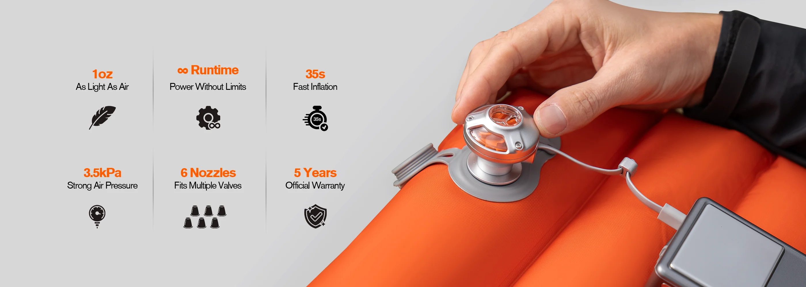 GIGA PUMP Air isn’t just powered by a power bank—you can plug it into any device that supports 5V/3A output. Whether it’s a smartphone, solar panel, outdoor light, or Bluetooth speaker, as long as it delivers the required power, it can run the pump. This flexibility gives you more ways to stay light, mobile, and ready for adventure.