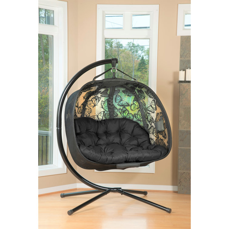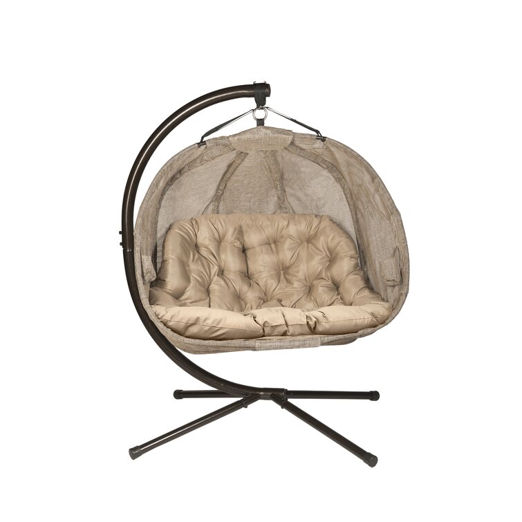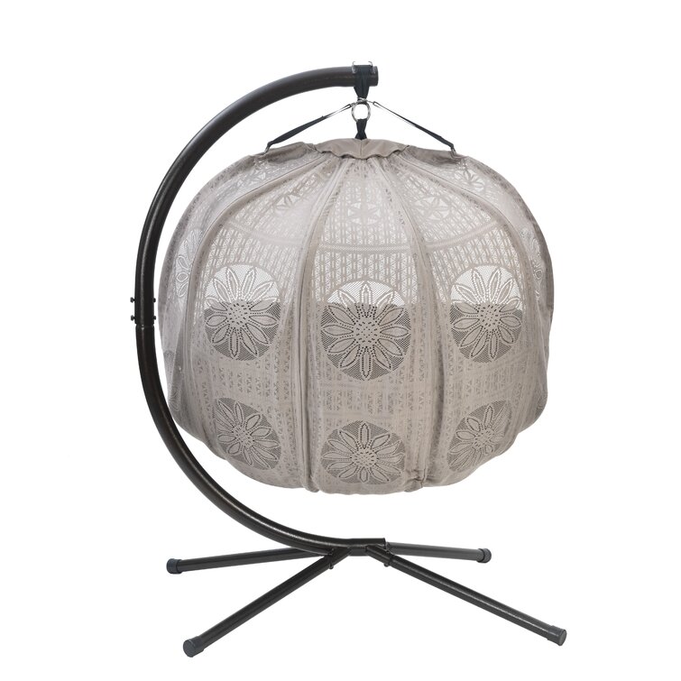 Kick back and relax in modern style with this 2-person porch swing. Crafted from a metal outer frame, it features an egg-shaped bench hanging from a J-shaped cantilever stand on splayed legs. We love that it's wrapped in sheer polyester fabric that lets the light through just a little, while an included cushion with generous filling and deep tufting lets you lounge and relax in comfort. The seat measures 50'' wide and supports up to 400 lbs., just right for two people (or just one, if you don't want to share). Best of all, it's UV-resistant, so it holds its own in the outdoors.