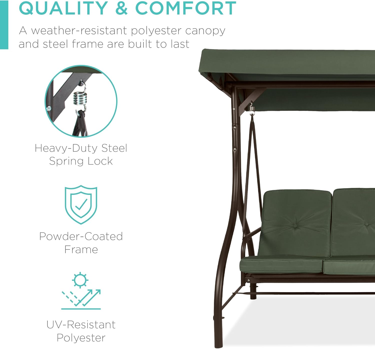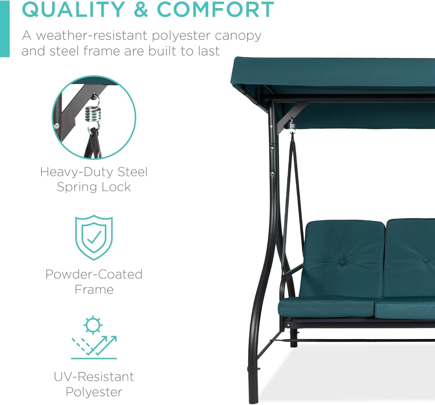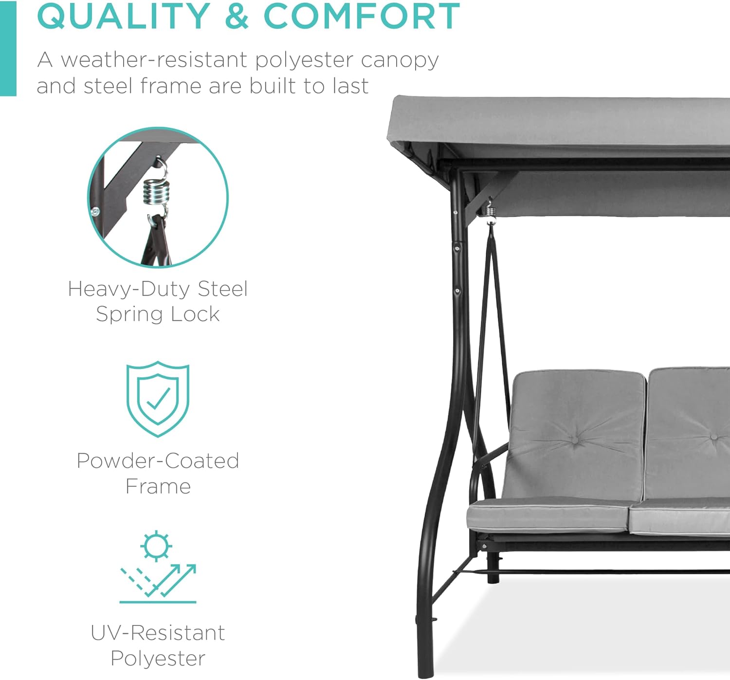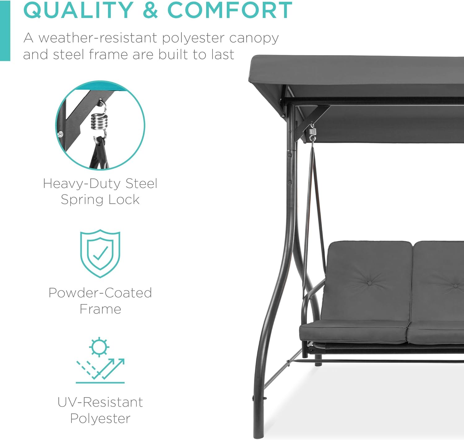 - QUALITY & COMFORT: This swing glider combines a weather-resistant polyester canopy and cushion covers with a powder-coated steel frame to ensure years of outdoor enjoyment!