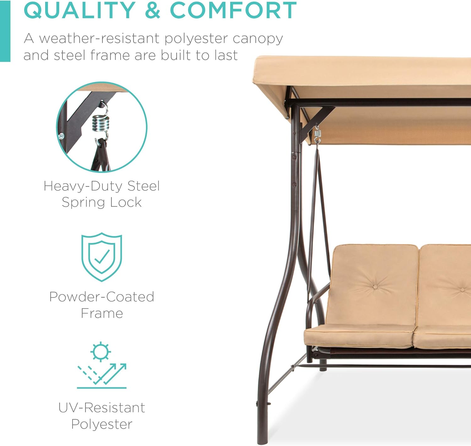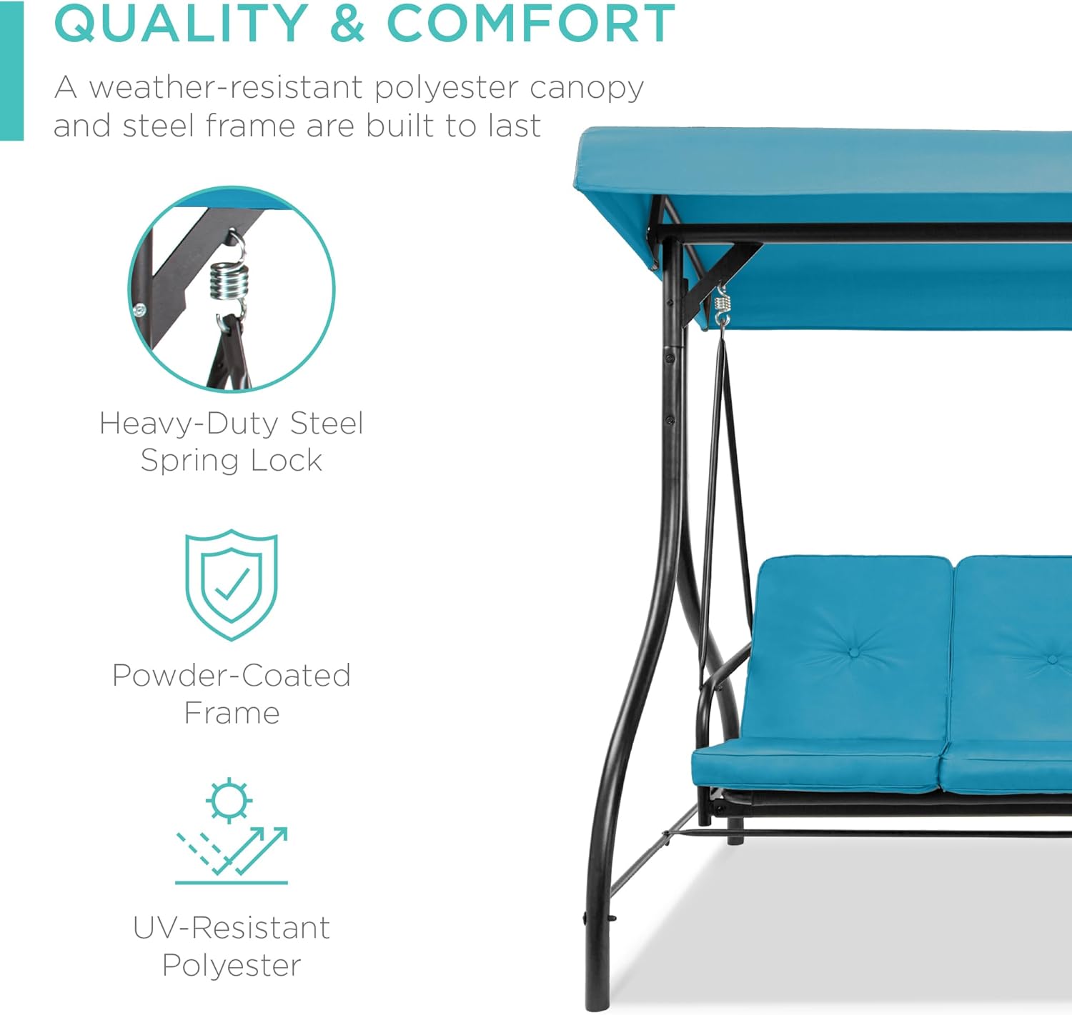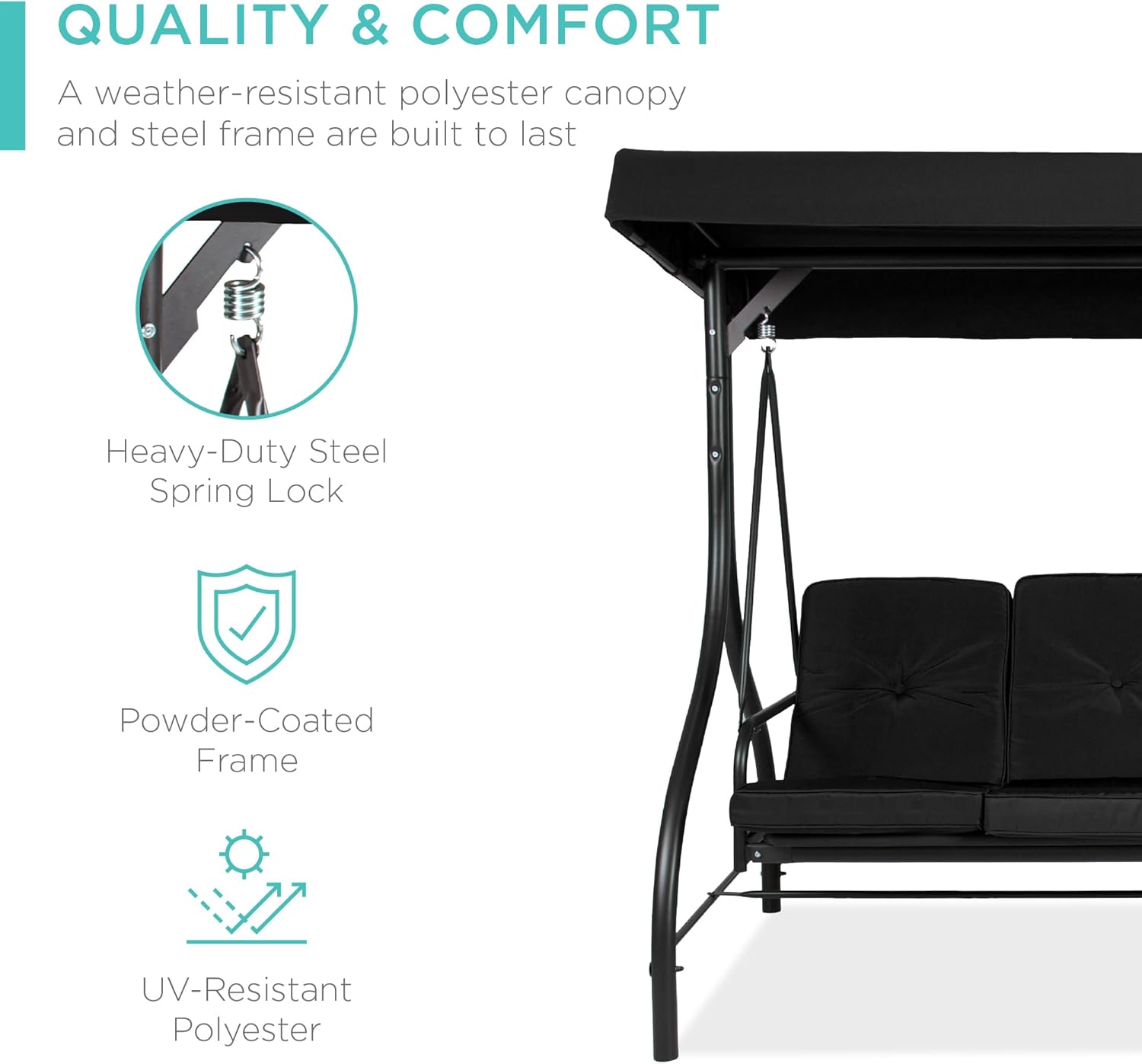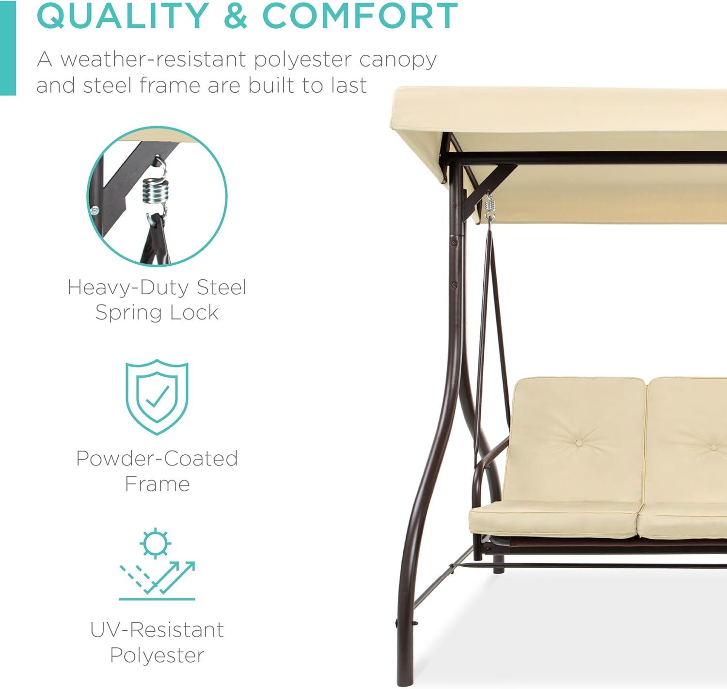 - QUALITY & COMFORT: This swing glider combines a weather-resistant polyester canopy and cushion covers with a powder-coated steel frame to ensure years of outdoor enjoyment!