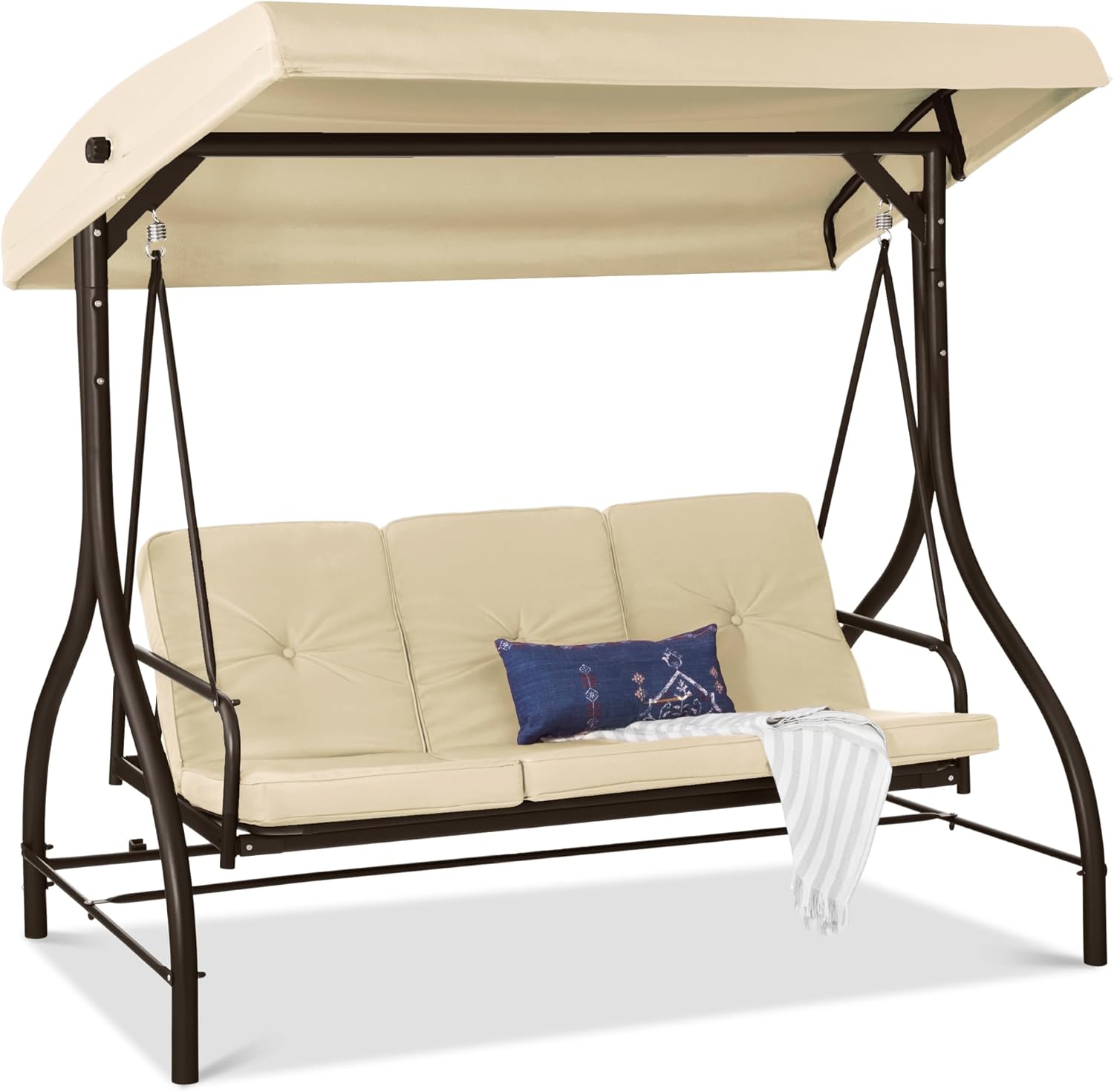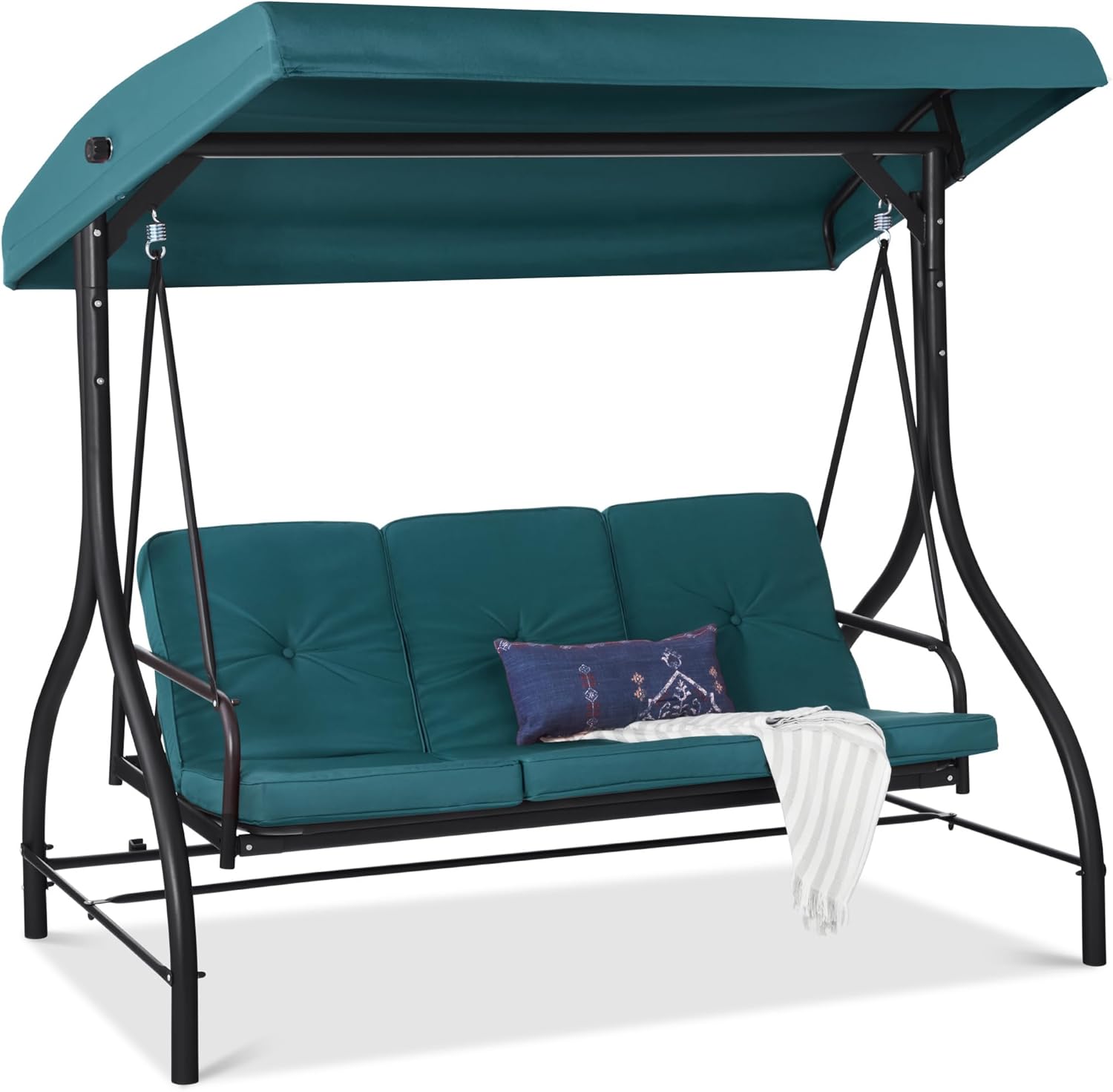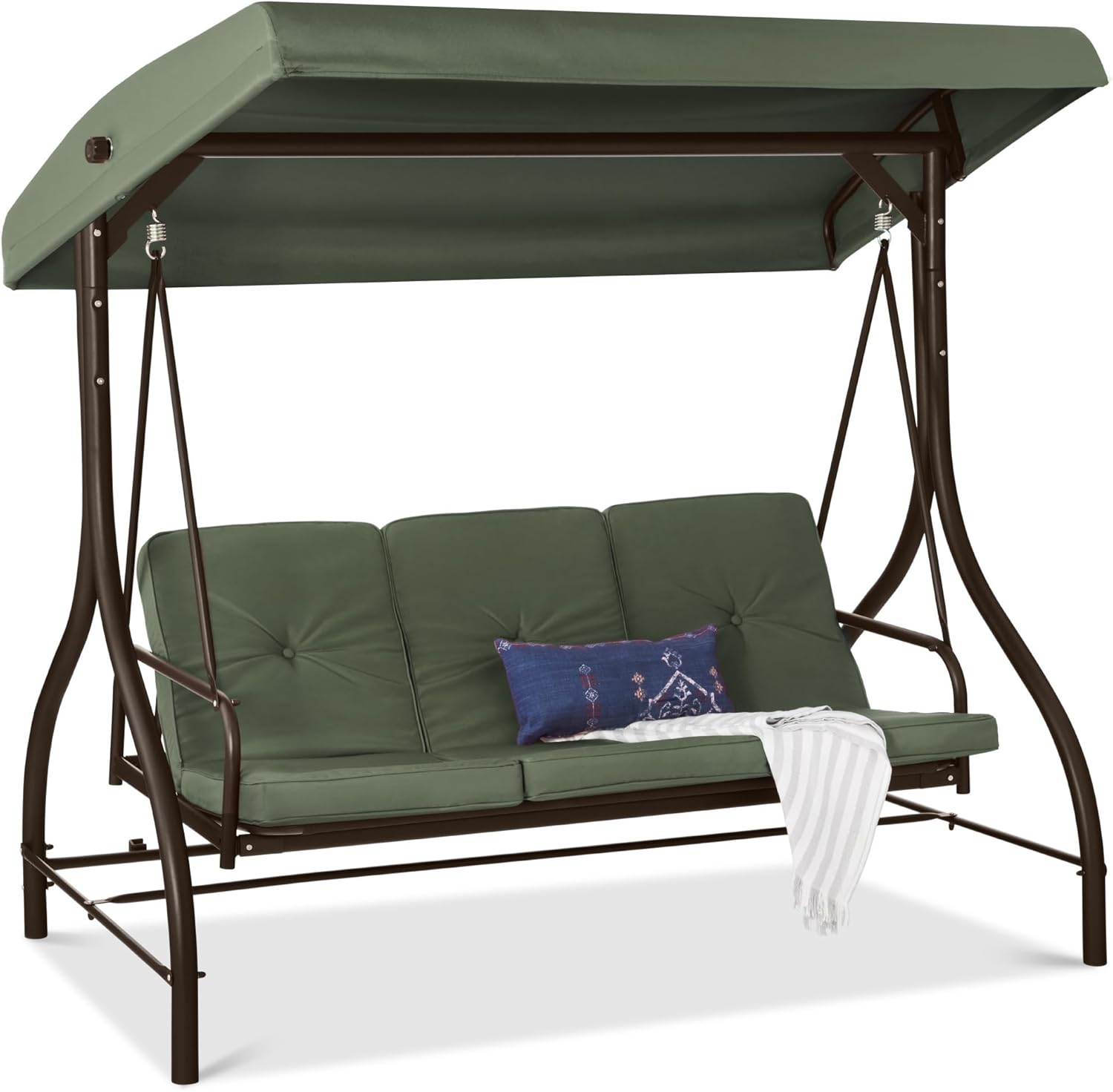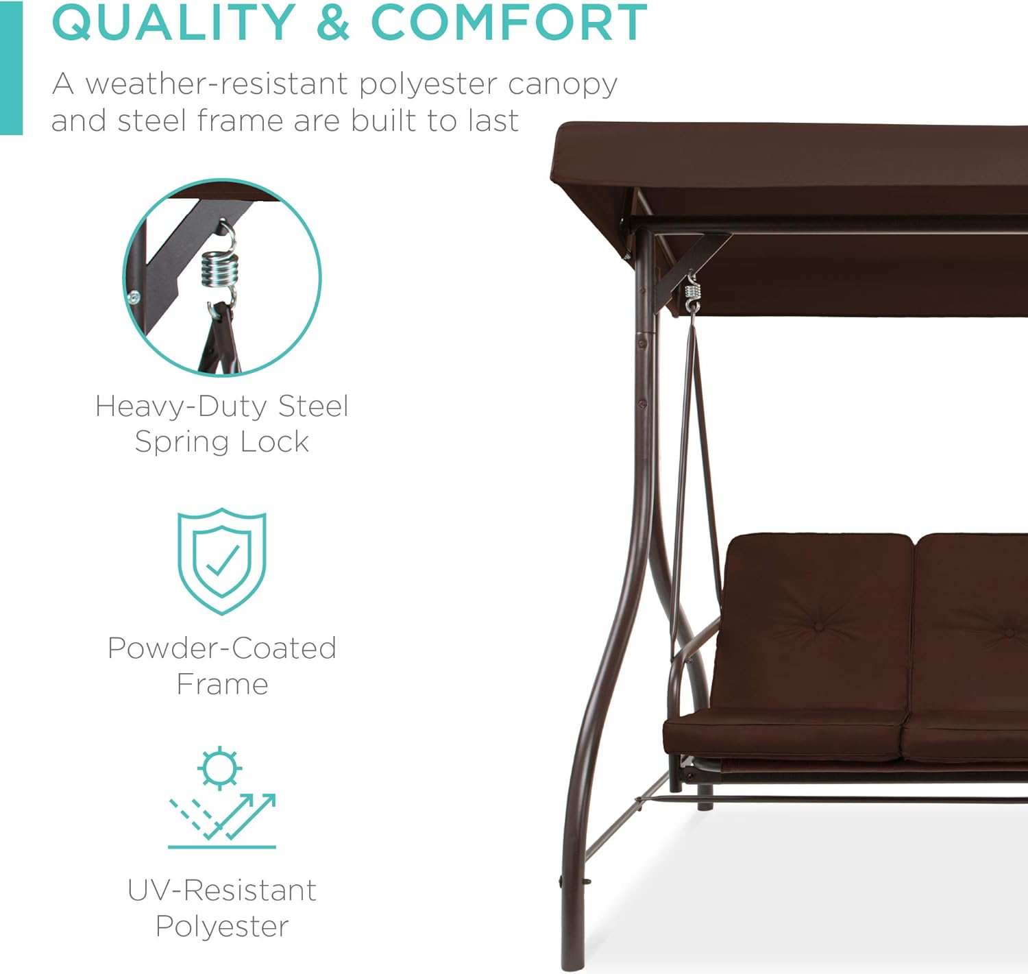 - QUALITY & COMFORT: This swing glider combines a weather-resistant polyester canopy and cushion covers with a powder-coated steel frame to ensure years of outdoor enjoyment!