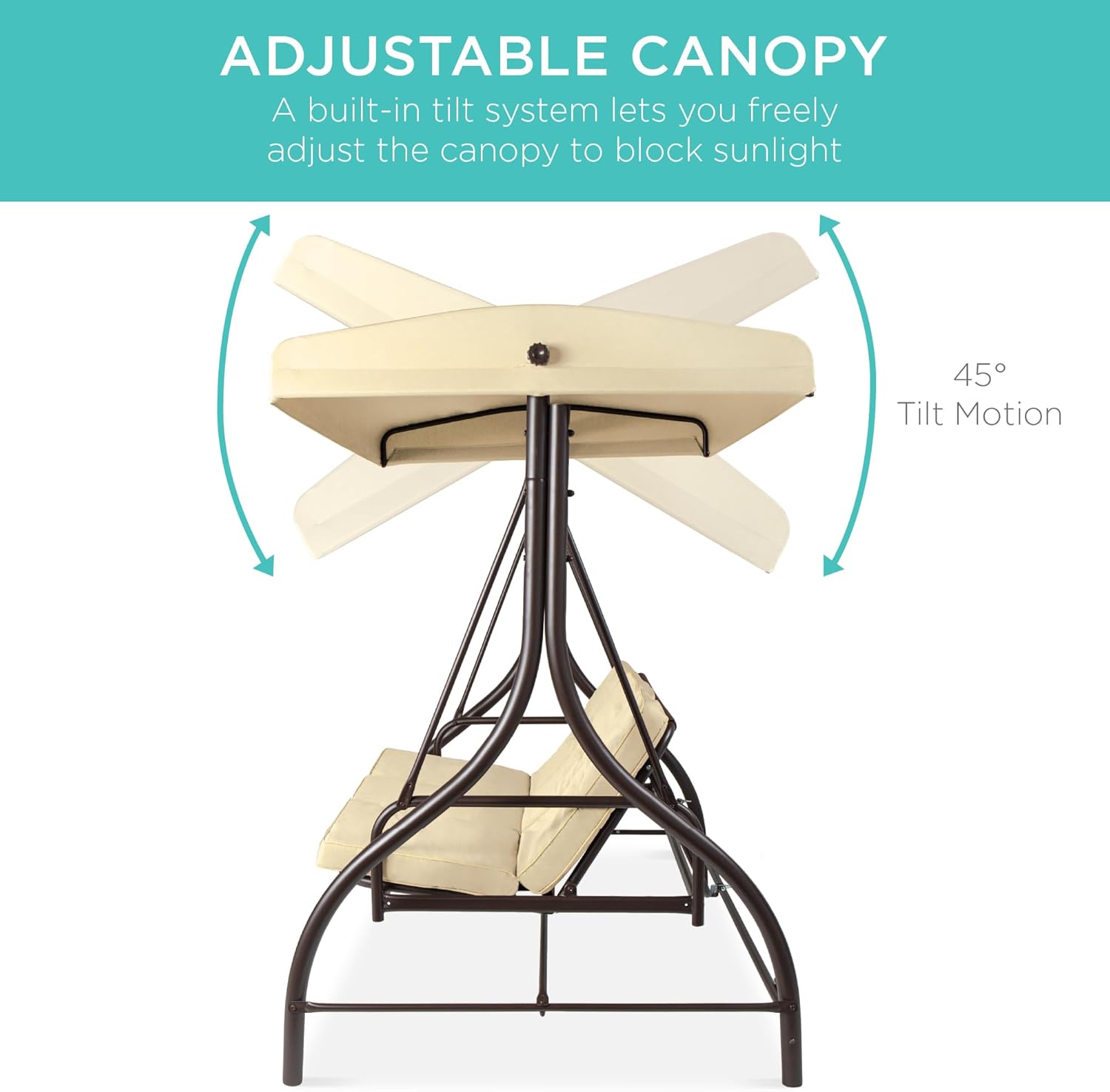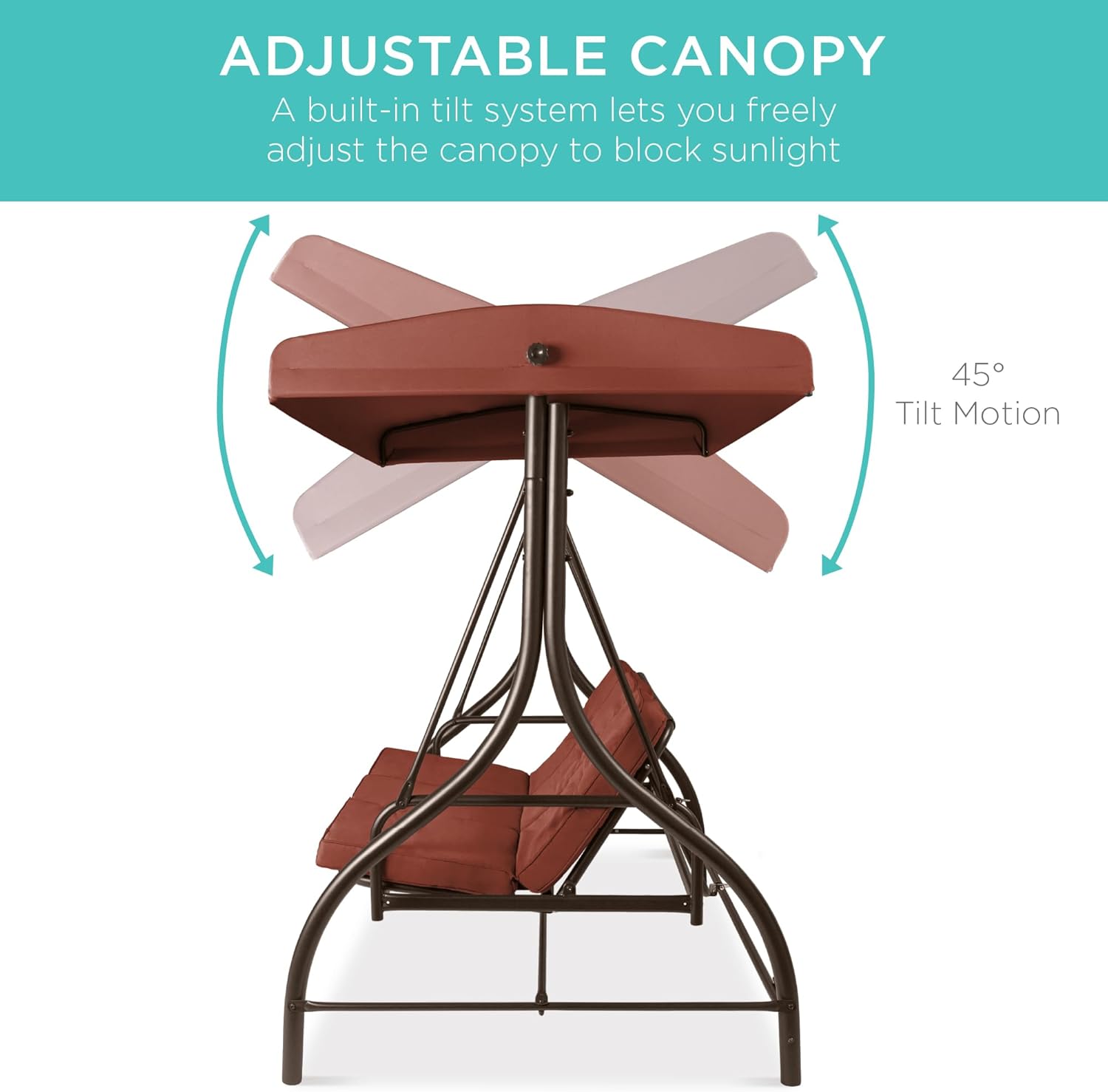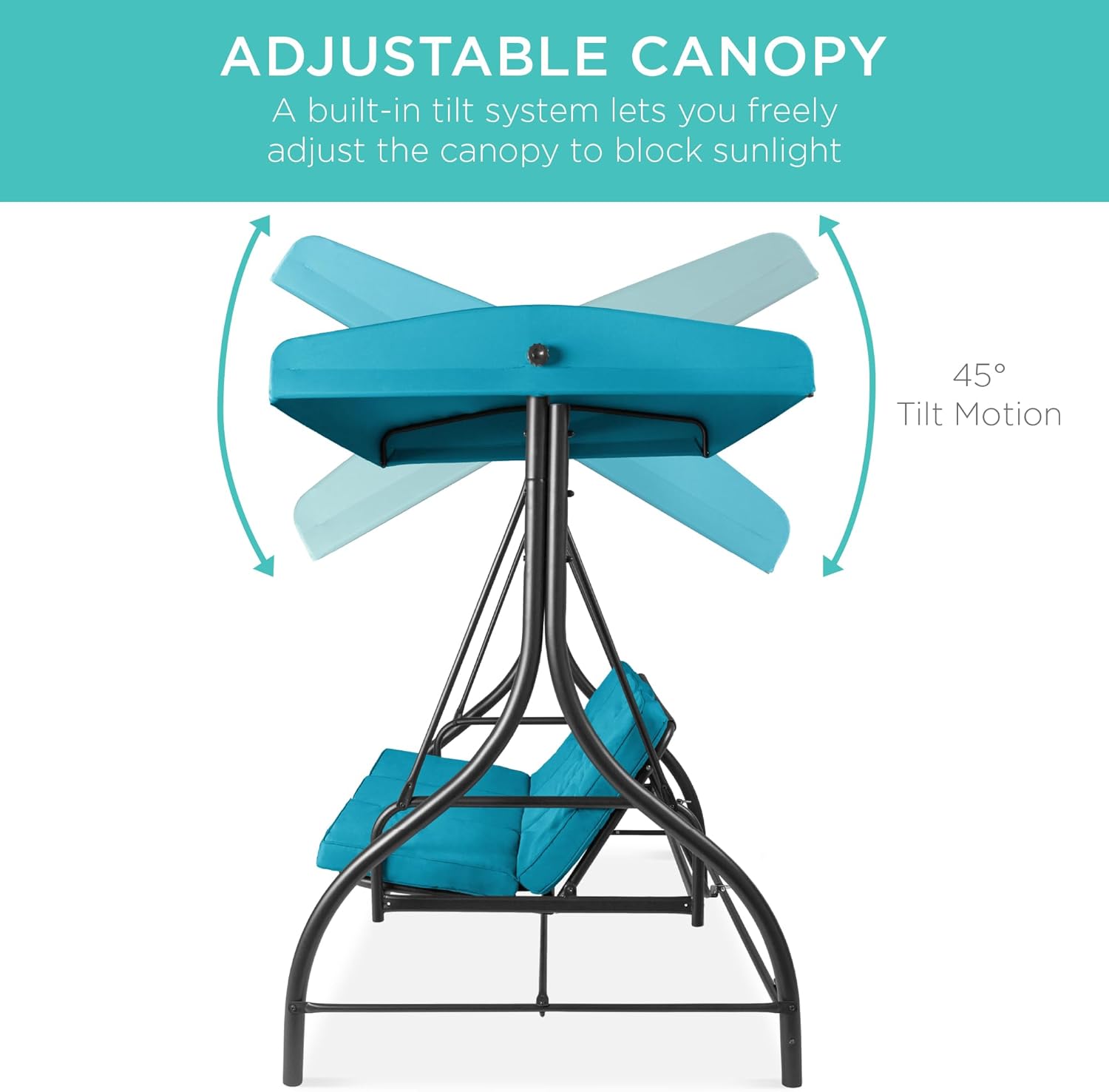 - ADJUSTABLE CANOPY: A built-in tilt system allows you to adjust the angle of the canopy (up to 45-degrees) forward and backward to block the sun all day long