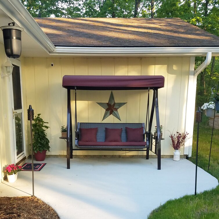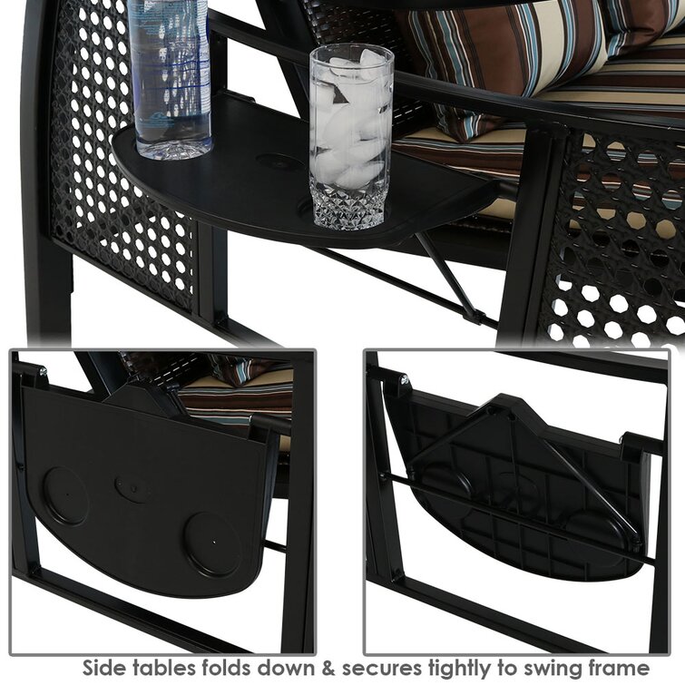 Snuggle up to sumptuous comfort as you relax in this Harden Steel Frame Cushioned Porch Swing with Stand. Perfect for placement on the porch, deck, patio or in the yard, this patio swing features a powder-coated tubular steel frame with polyester canvas canopy as well as polyester canvas seat cushions and back pillows. The locking wheels on each side of the canopy lock the tilt angle in-place so you can adjust for the best shade from the sun. Plus, the outdoor swing also features a side table on each side of the swing that easily lifts up for use or folds down for storage. so you have a place for your mobile device, book, snacks or drinks.