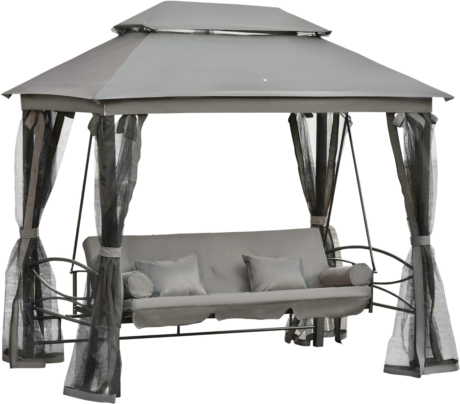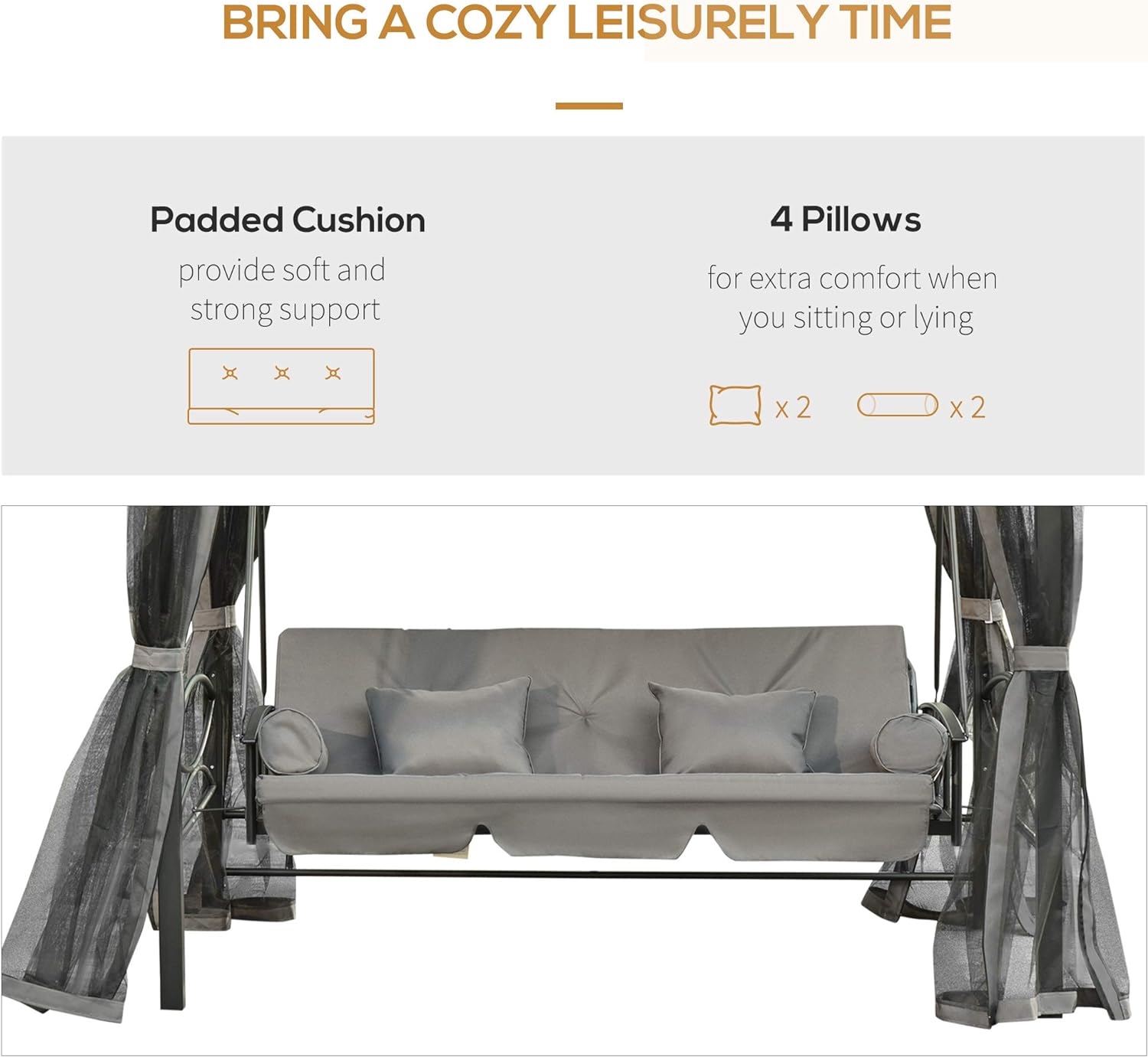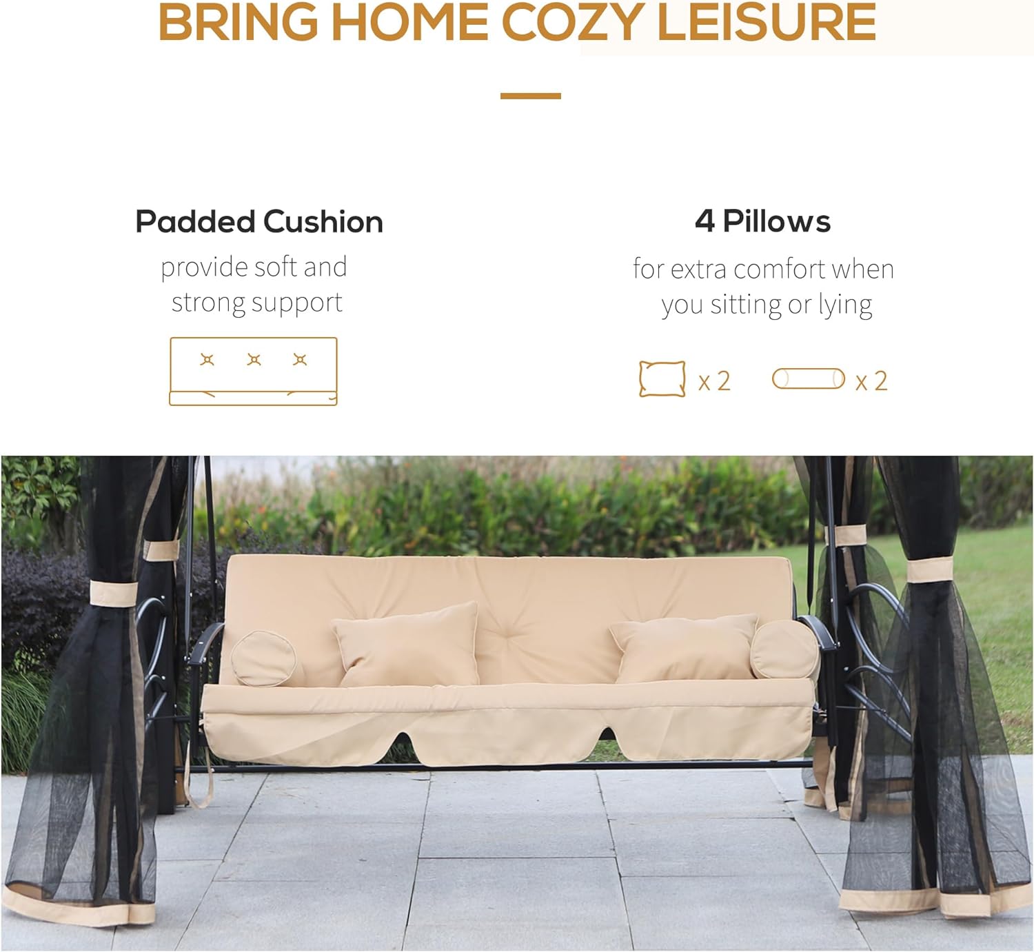 - Comfortable 3 Person Seating: Features a cushioned seat and backrest, and cozy throw pillows to help you enjoy the outdoors just a little more. Get a little outdoor exercise with the family or have a romantic nap under the canopy.