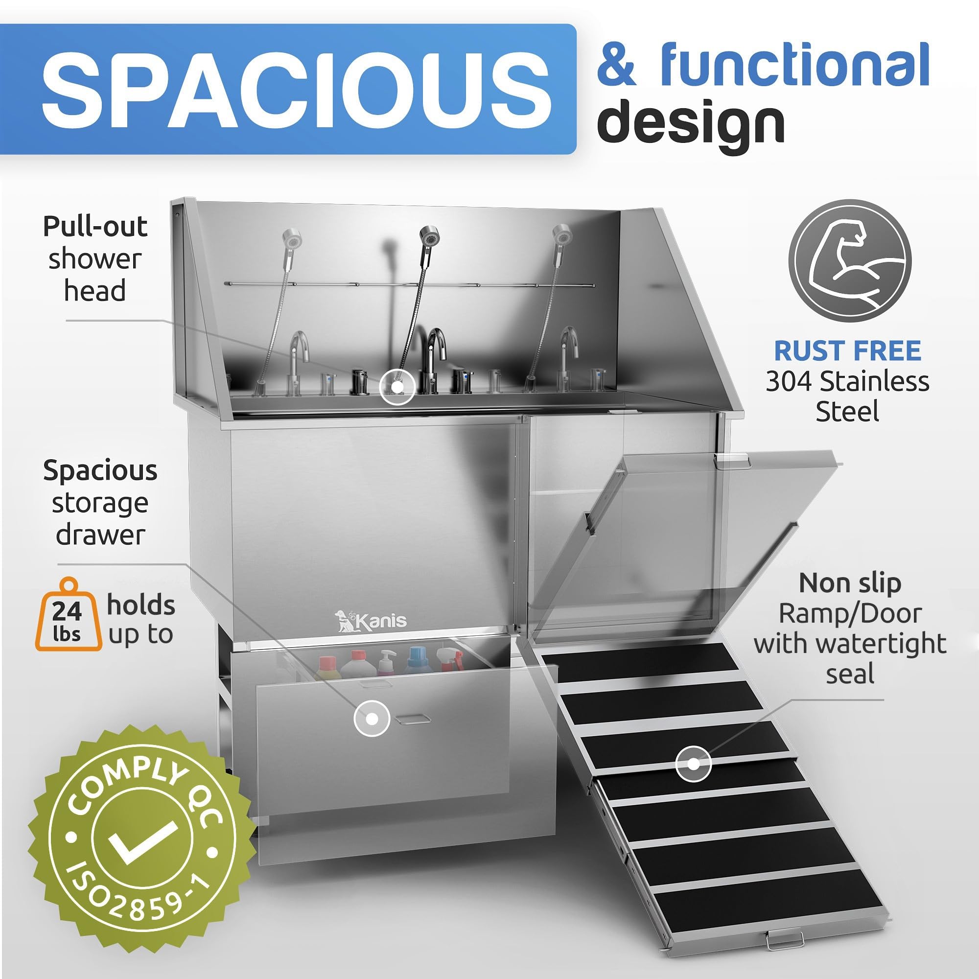 - TELESCOPIC RAMP FOR EASY ACCESS - KANIS Pet Grooming & Wash Tub features a Non-Slip Pet Ramp that locks in an upright position with a heavy-duty Watertight Seal to prevent water leakage. SLIDING STORAGE DRAWER - A great feature that will help you keep your dog bathing supplies and grooming accessories organized in one place. The drawer can support up to 24lb!