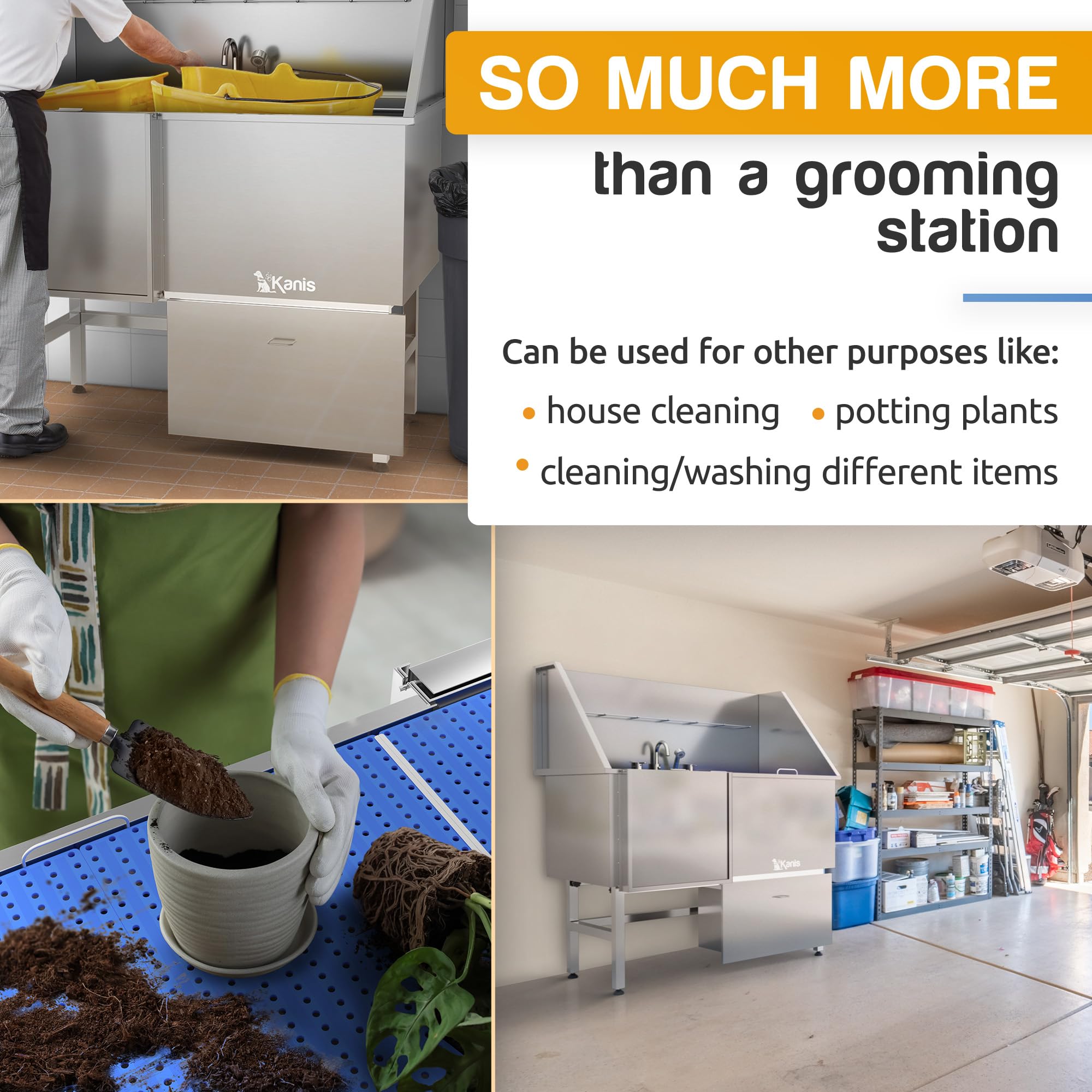- 50" UTILITY & GROOMING STATION - KANIS Proudly introduces The most Complete and Versatile dog bathtub! Suitable for general home cleaning and pet washing, our grooming sink is a must-have in a multi-functional utility room, laundry, or garage. Superior Quality, Durable & Rust-resistant 304 Stainless Steel, No Leak Fully Welded Construction and Easy to install.