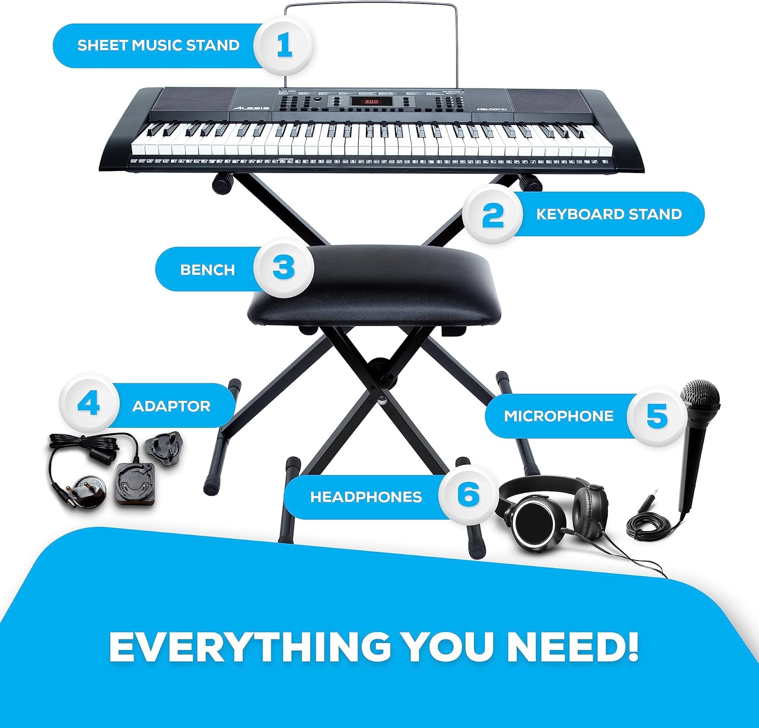 - Everything you Need - Includes an easy-to-assemble keyboard stand, bench with adjustable height settings, headphones, sheet music stand, microphone with 5ft. long cable for singing along while playing and a power adapter
