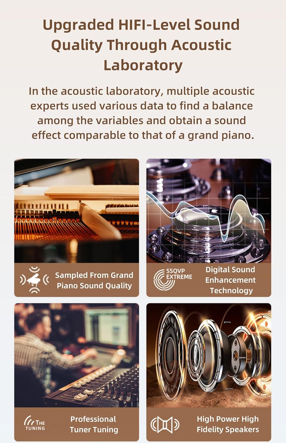 - 🎹【Upgraded HIFI-Level Sound Quality Through Acoustic Laboratory】In the acoustic laboratory, multiple acoustic experts used various data to find a balance among the variables and obtain a sound effect comparable to that of a grand piano.
