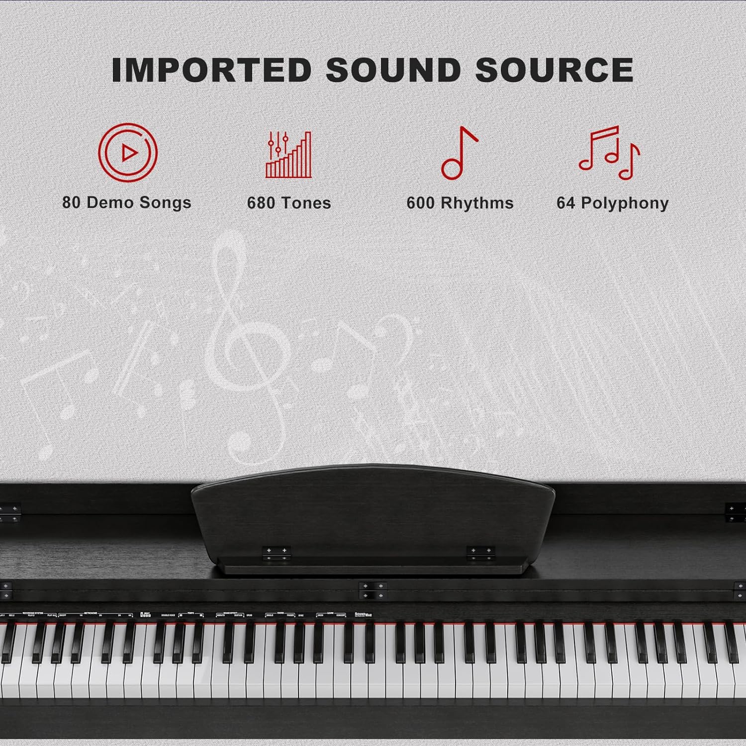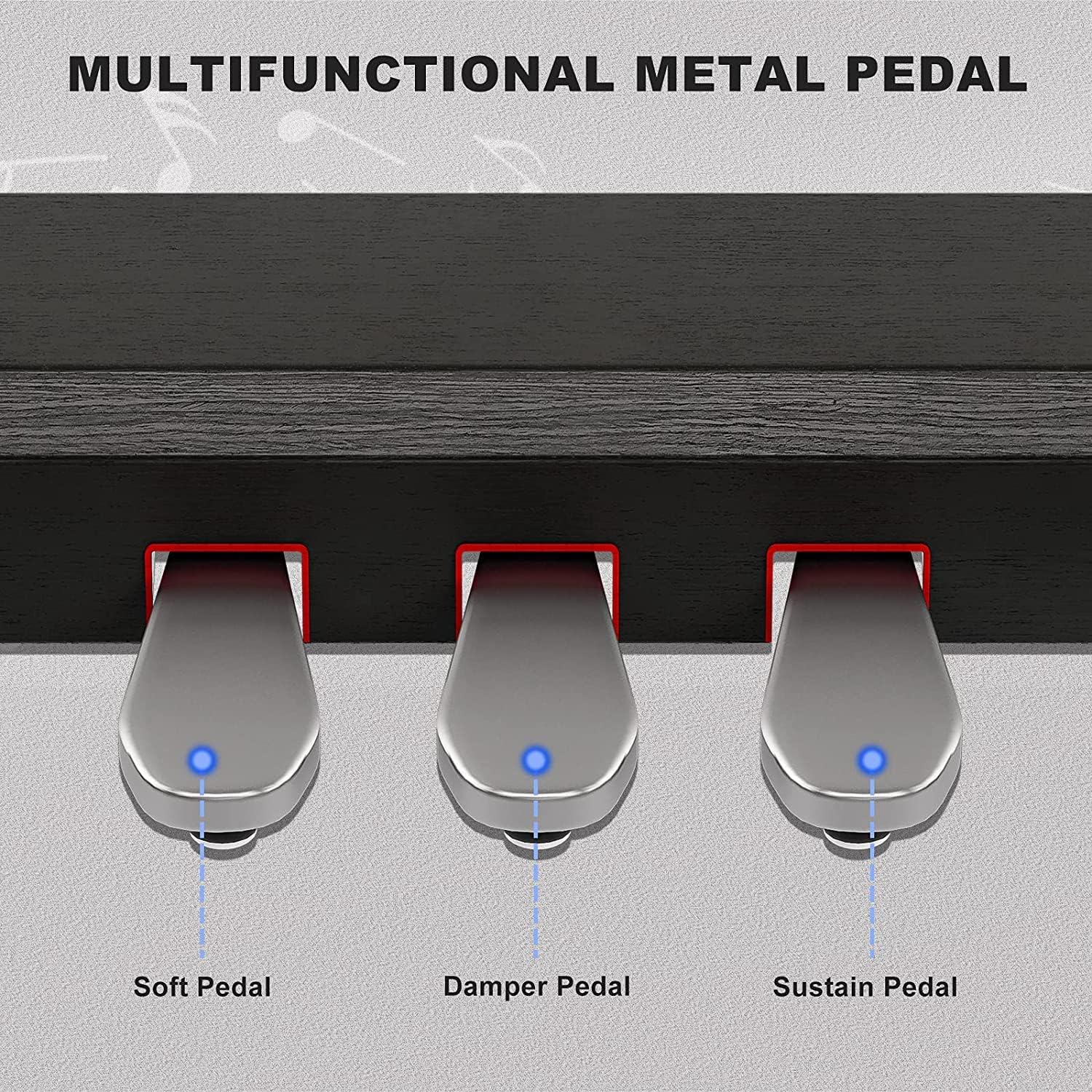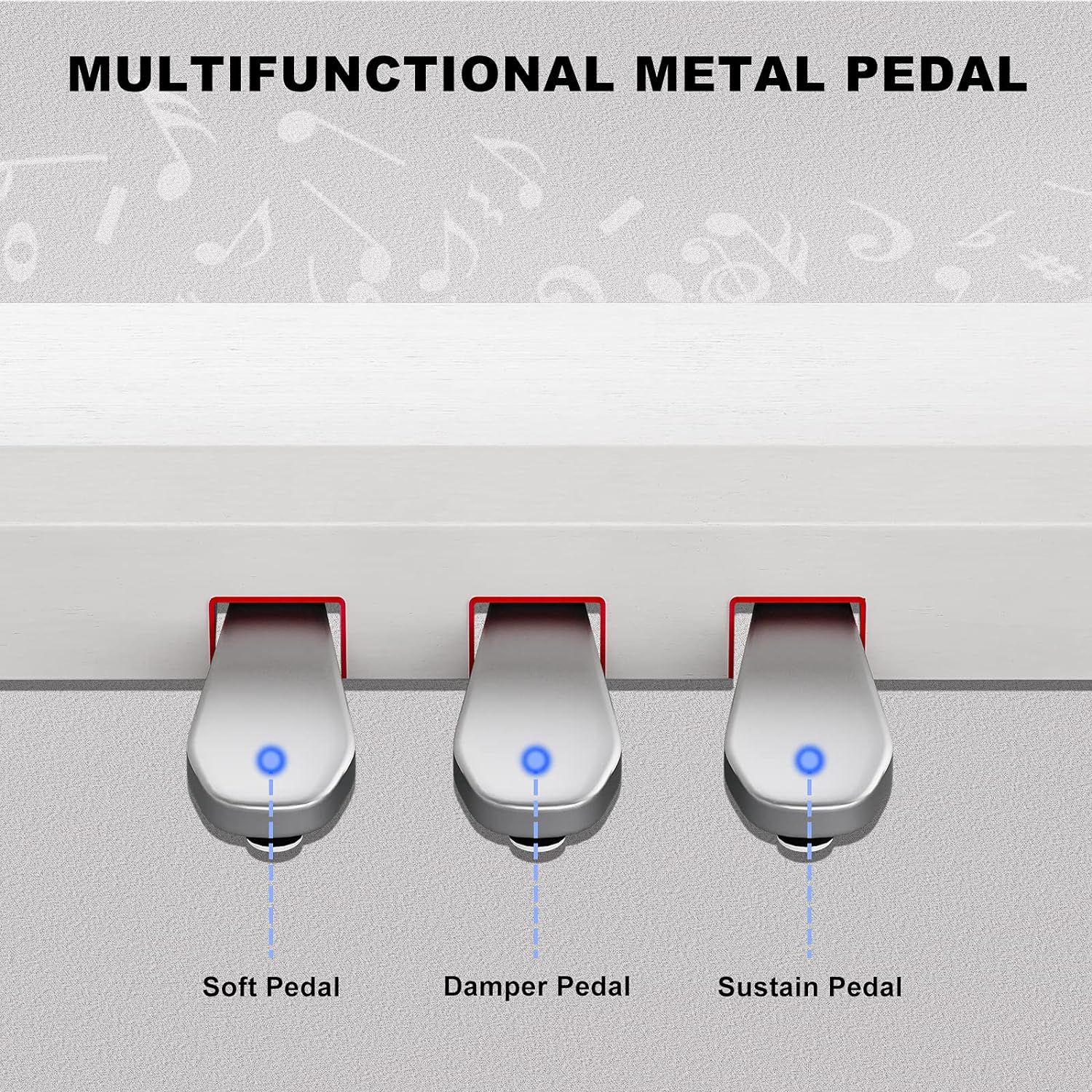 - 🎹 FEATURE-3 pedal system(Soft/Sustain/Rear sustain pedal)/LCD display screen/80 demo songs/480 tones/128 standard GM tones/200 present rhythms/64 Polyphony/Built-in stereo speakers/Slide cover design/Storage bench