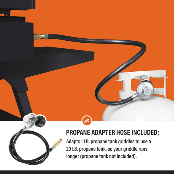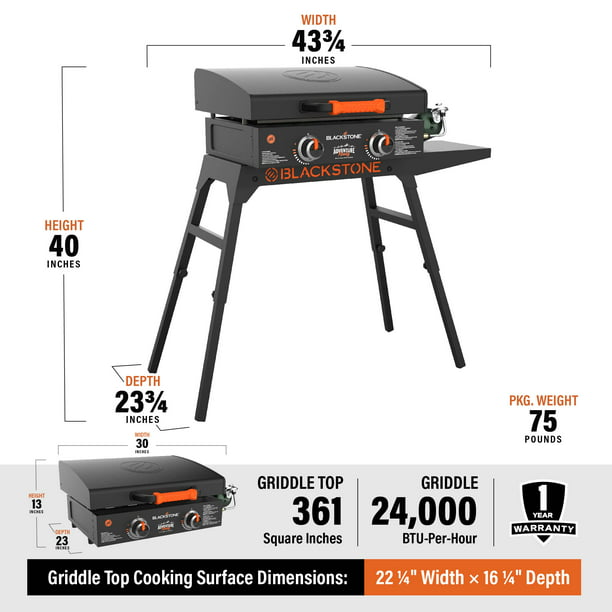 The Blackstone Adventure Ready 22" Propane Griddle with Hood, Legs, and Bulk Adapter Hose is the ideal package. Combine the already great tabletop griddle with a folding stand and this griddle will cook anywhere, any time of the year! A hood with a non-slip grip protects your griddle surface and traps 24,000 total BTUs of heat when grilling, no matter the location. With an included adapter hose, you can connect a 20-pound propane tank to your griddle, perfect for long hunts, fishing expeditions, or family camping trips. With 361 square inches of cooking space, this unit will cook burgers, hot dogs, steaks, eggs, pancakes, and much more. Dual H-syle burners evenly distribute heat across the griddle surface in two separate cooking zones, giving you ultimate control. This ultimate combination of Blackstone is sure to bring good food and memories to everyone!